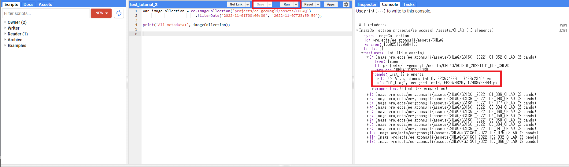 Scriptの上にあるSaveとRunボタンを実行後、Consoleの部分にバンド名が表示されます。必要な物理量のバンド名を確認してください。