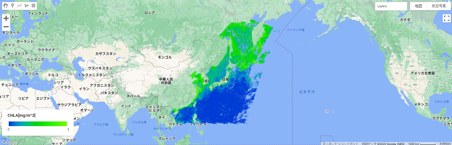 具体的には、クロロフィルa濃度(CHLA)という水質に関連したGCOM-CデータをGEE上でロード(呼び出し)・表示する手順を説明します。
