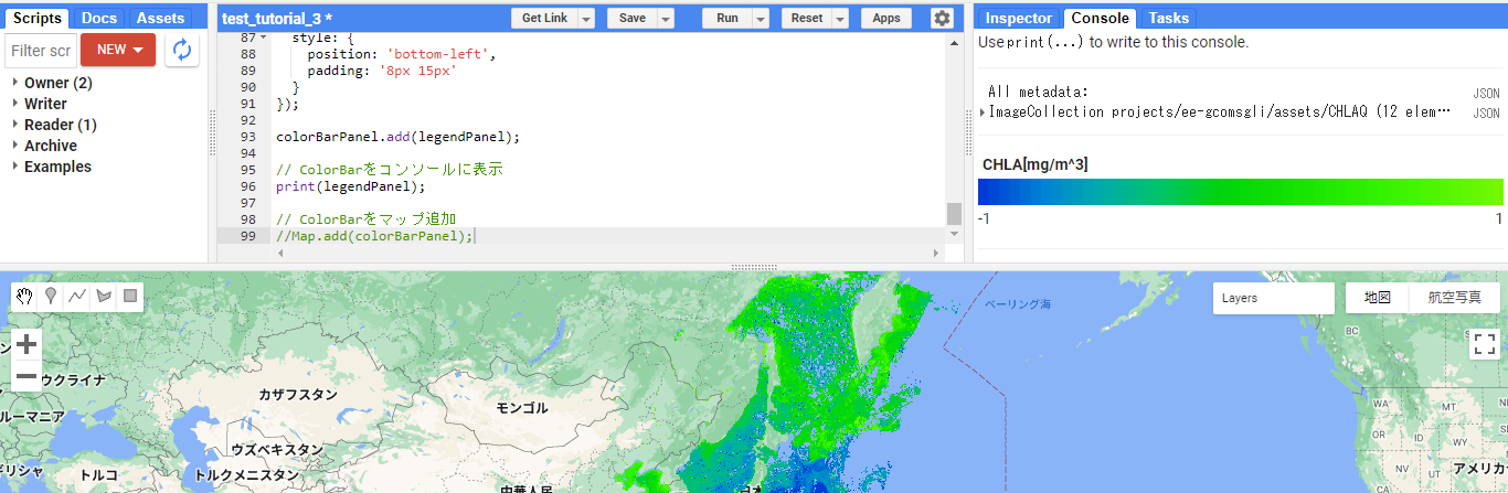 Scriptの上にある、SaveとRunボタンを実行すると、下のマップにImageCollectionが表示されます。