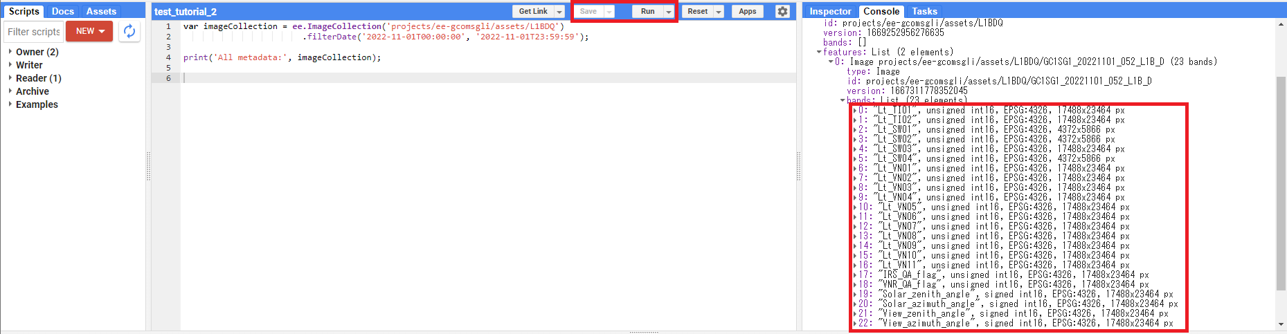 Scriptの上にある、SaveとRunボタンを実行後、Consoleの部分にバンド名が表示されます。必要な物理量のバンド名を確認してください。