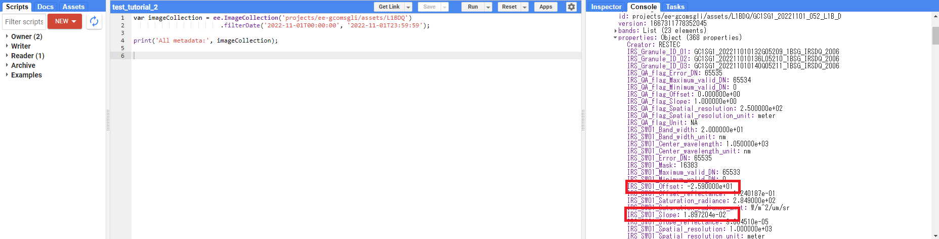 先ほどのConsoleから、propertiesを開き、Slope、Offsetのプロパティ名を確認してください。