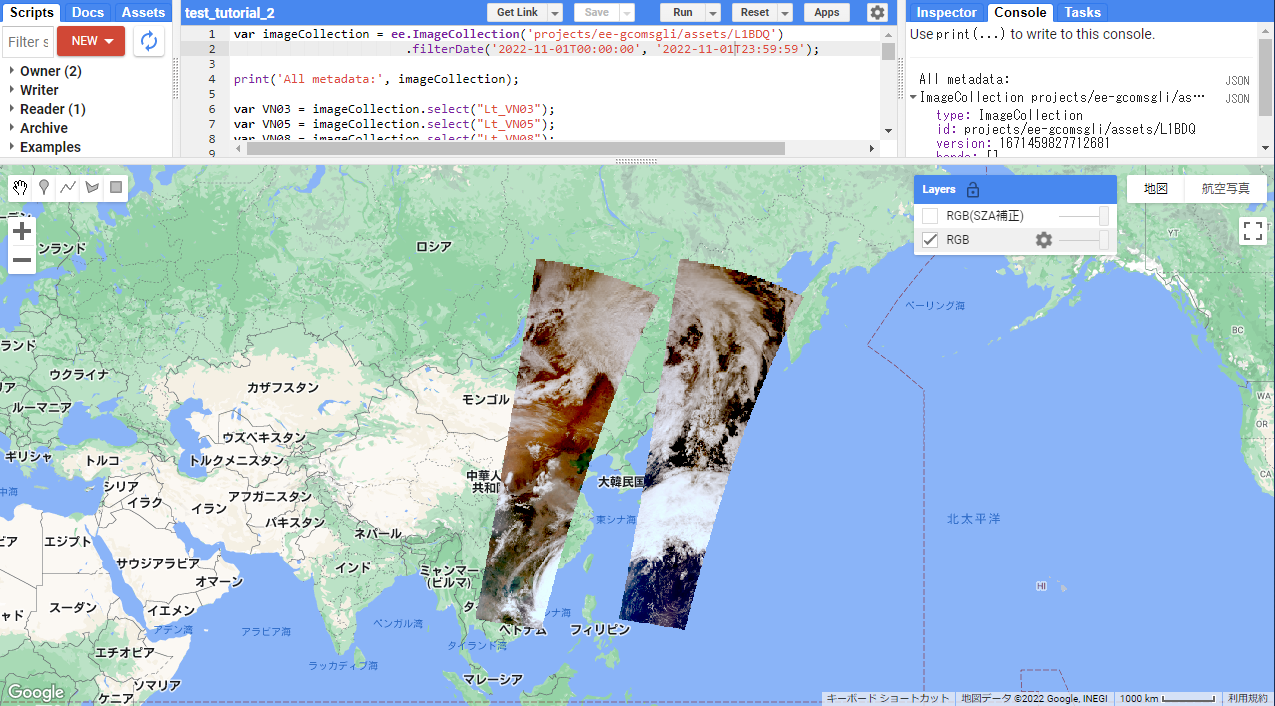 GCOM-C/SGLIの複数バンドデータ(ImageCollection)を使用してRGB画像をマップ表示するまでのチュートリアルです。