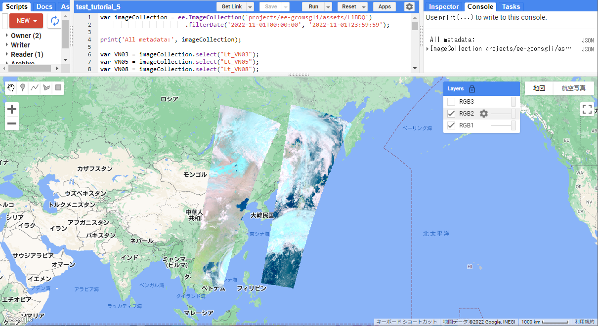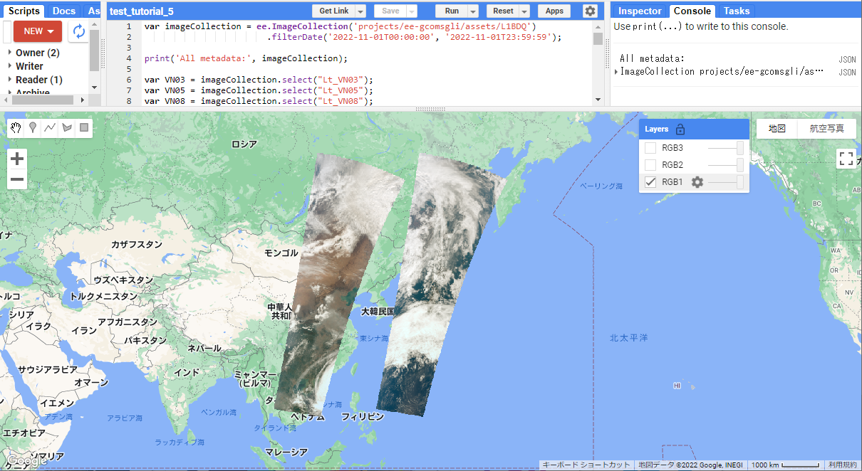 Scriptの上にある、SaveとRunボタンを実行すると、下のマップにImageCollectionが表示されます。