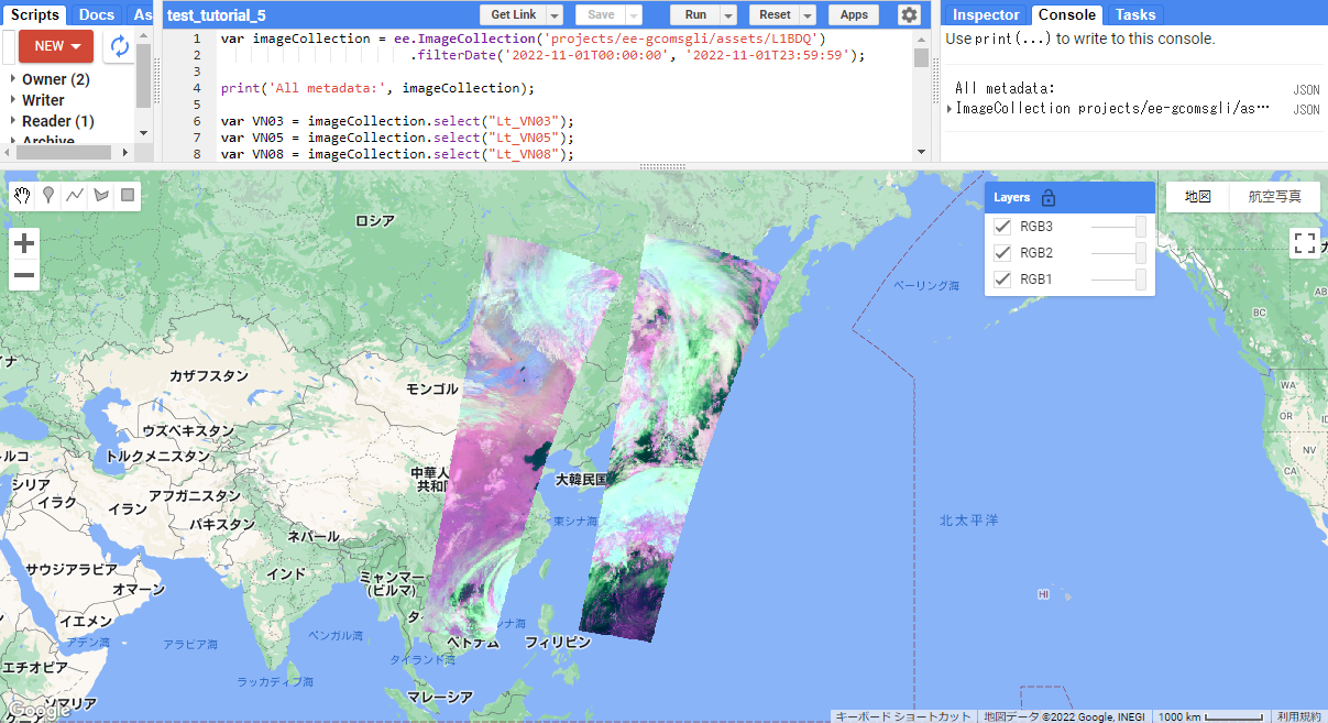 GCOM-C/SGLIの複数バンドデータ(ImageCollection)を使用してRGB画像をマップ表示するまでのチュートリアルとなります。