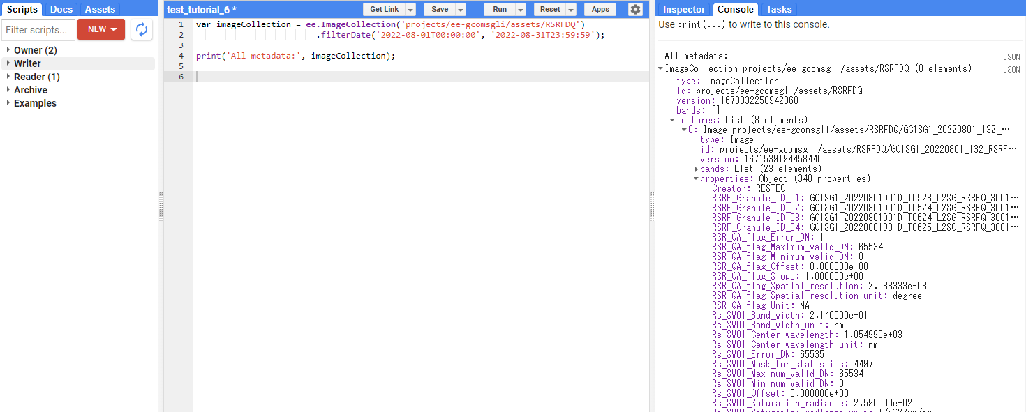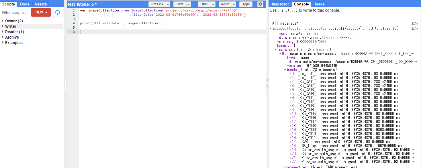 Scriptの上にある、SaveとRunボタンを実行すると、下のマップにImageCollectionが表示されます。